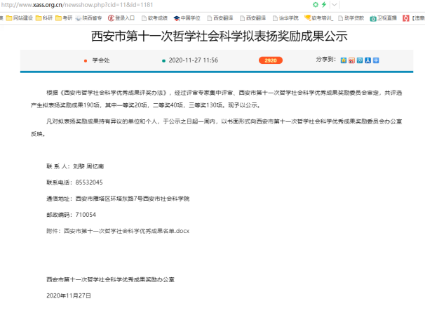 西安市第十一次哲学社会科学优秀成果名单