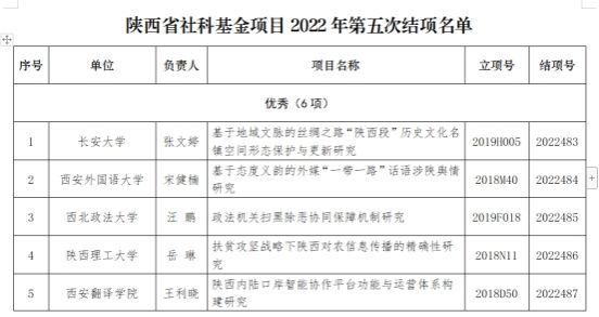 近日,陕西省哲学社会科学工作办公室召开省社科基金项目结项会议,研究审议2021年陕西省社会科学基金年度项目结项申请材料。经审核,共有49项课题符合结项要求,准予结项。我校5位教师提交的结项报告均顺利通过结项,其中《陕西内陆口岸智能协作平台功能与运营体系构建研究》结项结果为优秀。