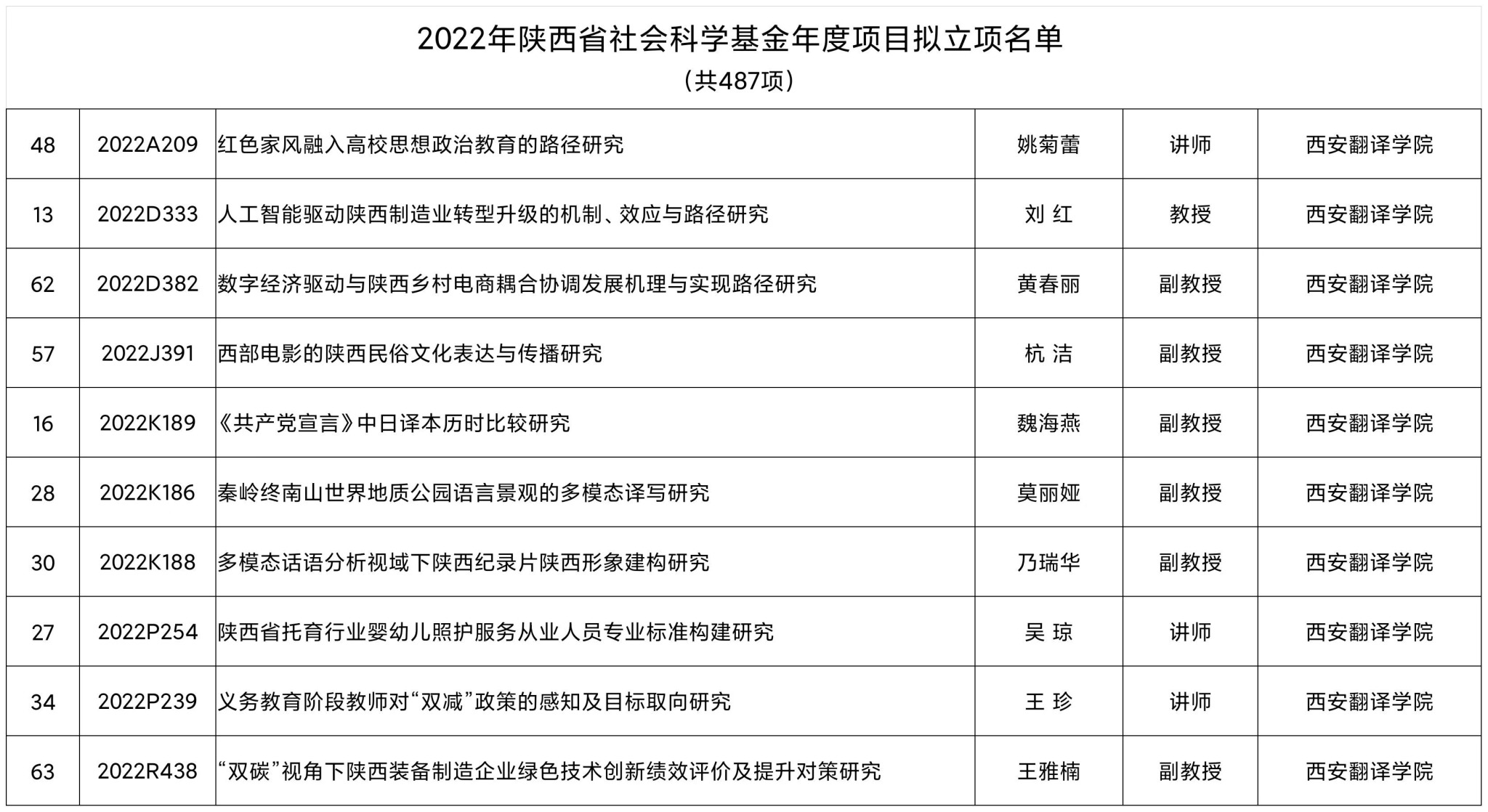 8月11日,陕西省哲学社会科学工作办公室公示了2022年度陕西省社科基金年度项目拟立项名单,本年度共拟立项487项课题,我校共有10项课题进入年度项目公示,拟立项数再创历史新高,也属同类院校中数量最多的高校。