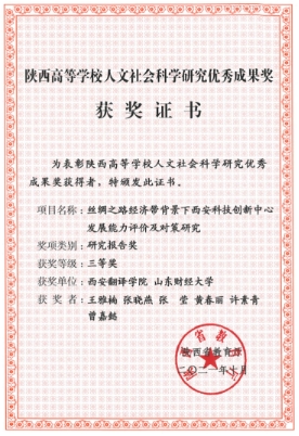 获奖情况 | 1. 2020年12月,荣获“西安翻译学院第二届人文社科优秀成果奖一等奖”; 2. 2021年10月,荣获陕西省教育厅评选的“陕西高等学校人文学会科学研究优秀成果三等奖”。 |