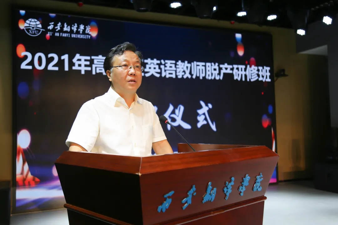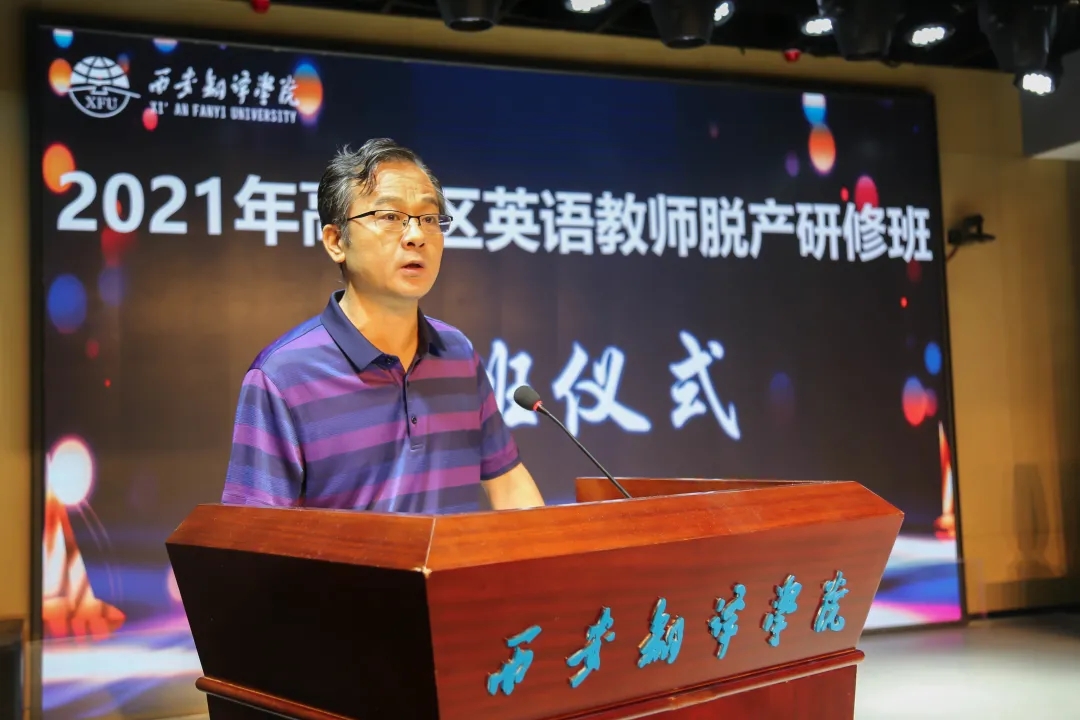 西安翻译学院党委副书记、副校长郭炜代表西安翻译学院向长期扎根陕西基础教育工作一线、为陕西教育事业发展辛勤耕耘、默默奉献的各位领导和老师表示由衷的敬意和热烈的欢迎,并简单介绍了我校的发展历史。并且他指出2021 年高陵区中学英语教师脱产研修班项目的老师们来校学习,是对学校继续教育工作的肯定,是对学校培训能力的肯定,也是教育工作者之间一次难得的交流机会。希望大家能珍惜本次培训机会,认真学习、深入交流、学有所得、习有所获,提高自身教学能力和专业水平,不断增强立德树人的本领。