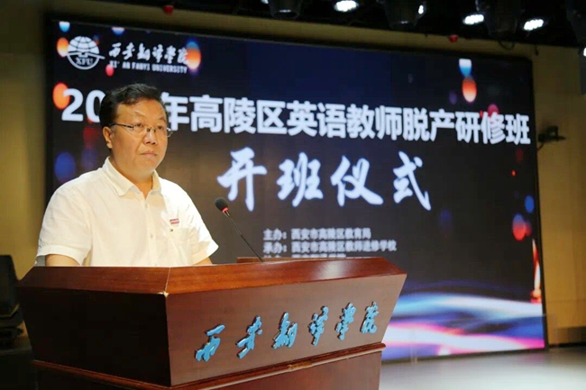 为进一步优化高陵区英语学科校本研修模式,加强英语师资队伍建设,7月10日,由西安市高陵区教育局主办,西译培训学院和西安市高陵区教师进修学校共同承办的2021年高陵区小学英语教师脱产研修班在西译开班。高陵区教育局党委副书记杨波,高陵区教师进修学校校长邢小军、副校长刘朝阳,西安翻译学院副校长郭炜,继续教育学院副院长刘远征,以及来自高陵区一线60名英语教师参加开班仪式。