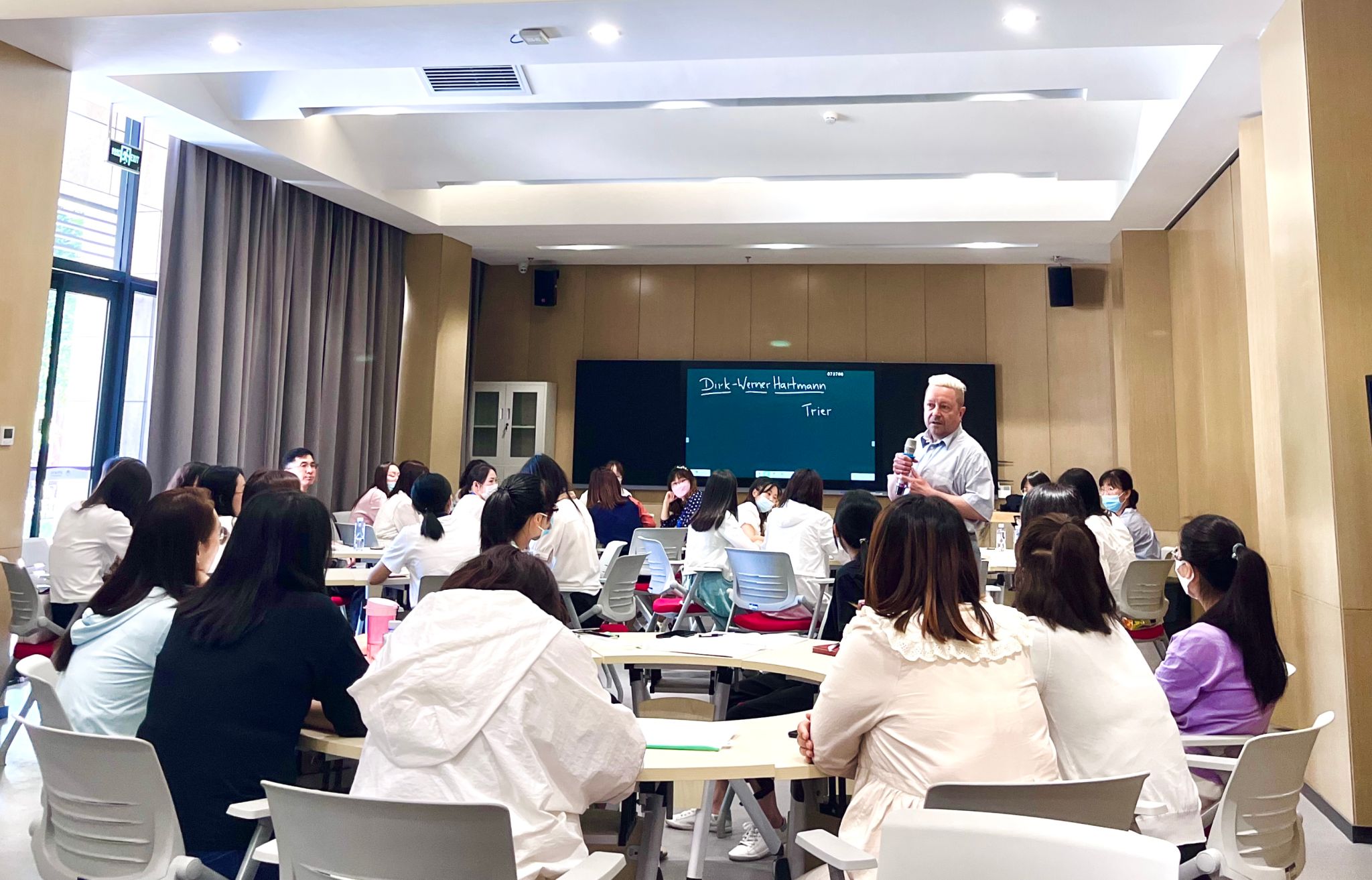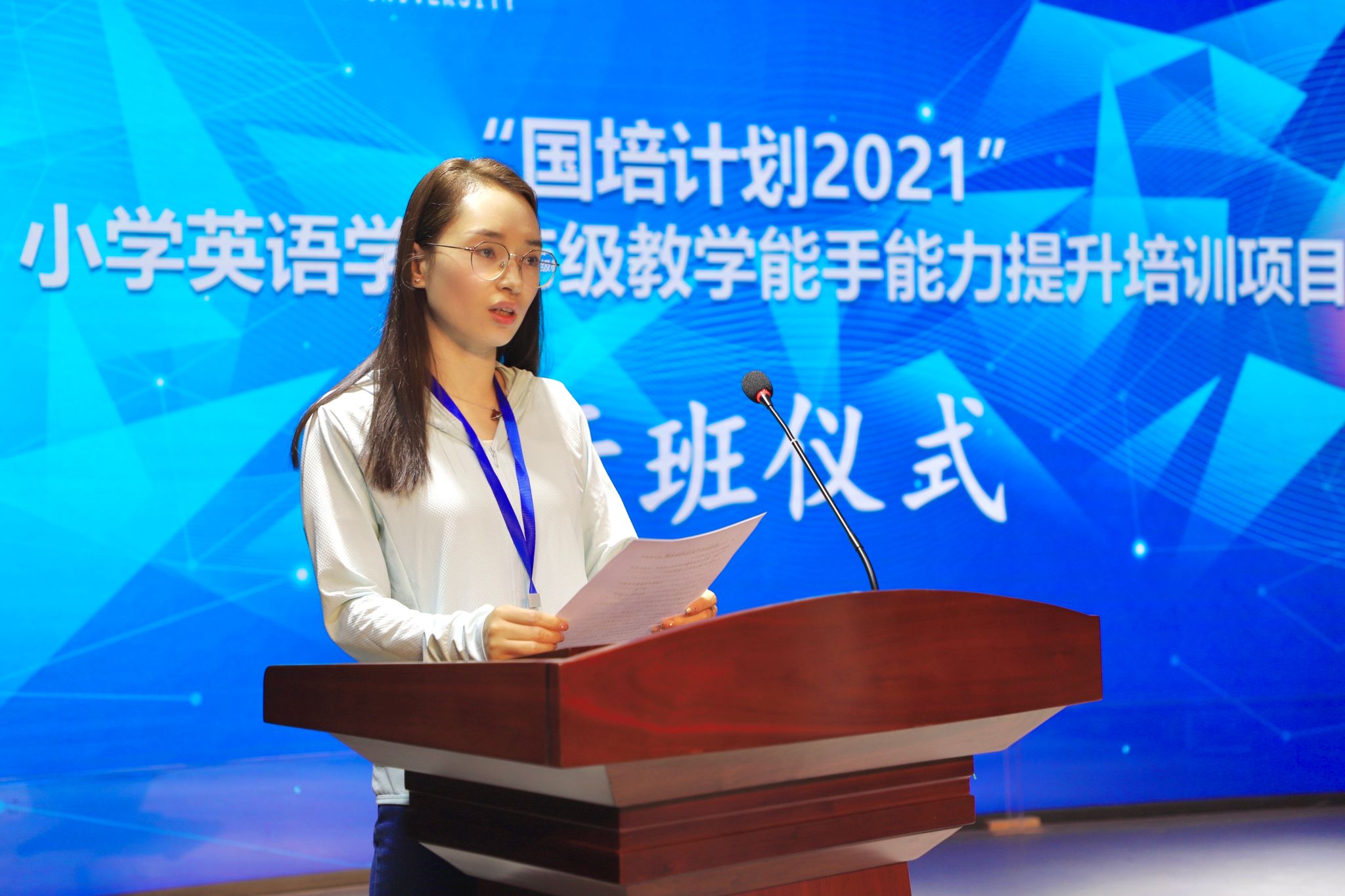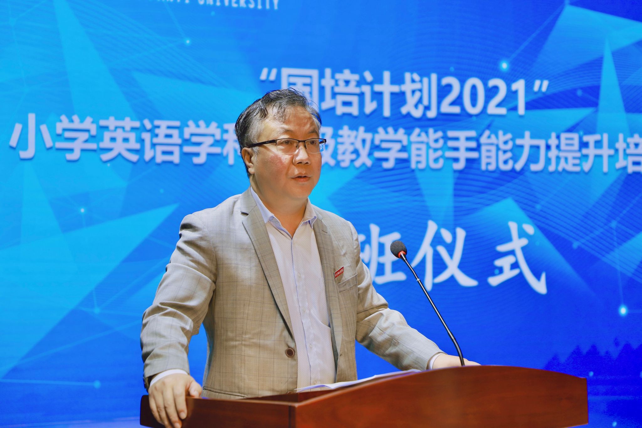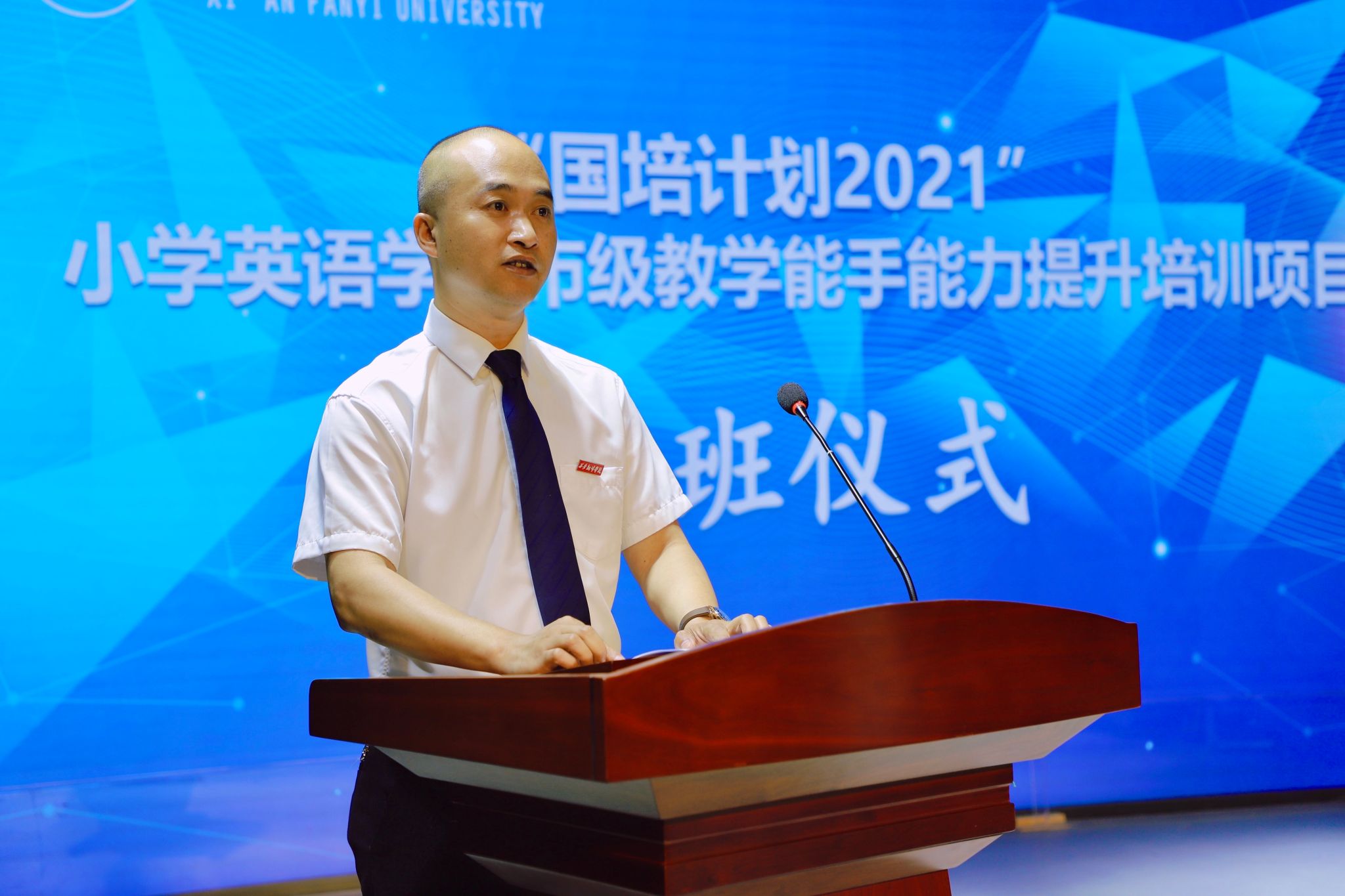5月23日上午,“国培计划 2021”小学英语学科市级教学能手能力提升培训项目在西安翻译学院正式开班。我校副校长兼教务长齐玉水,党委副书记、副校长郭炜,教务处处长秦晓梅,人力资源处副处长、教师发展中心副主任武娟,英文学院副院长李燕,我校外籍专家、陕西省人民政府三秦友谊奖获得者 Dirk出席。开班仪式由继续教育学院副院长刘远征主持。