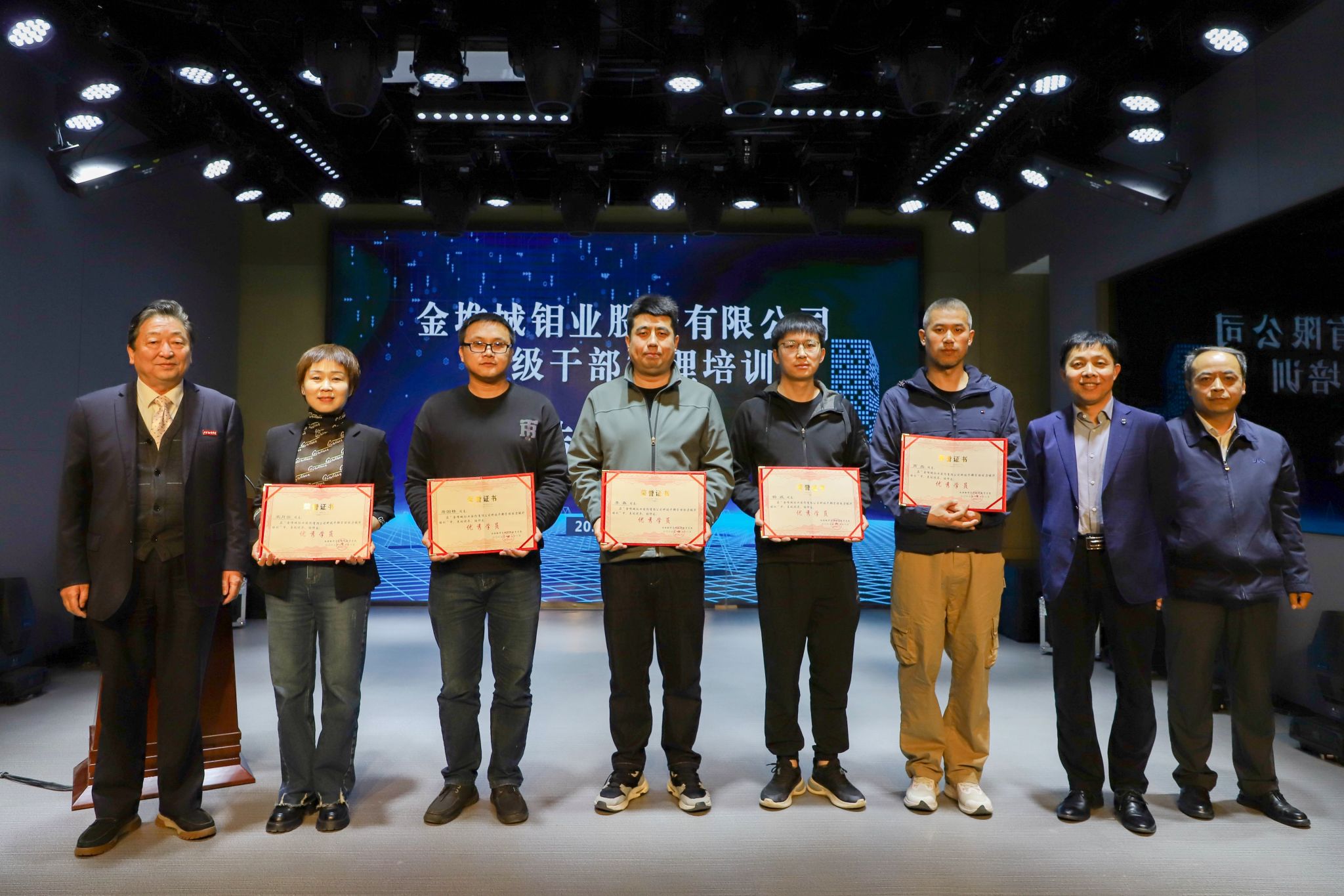 参会领导为本次培训评选出的宋月云、詹国栋、李森、杨威、高磊五位优秀学员颁发奖状并与大家合影留念。
