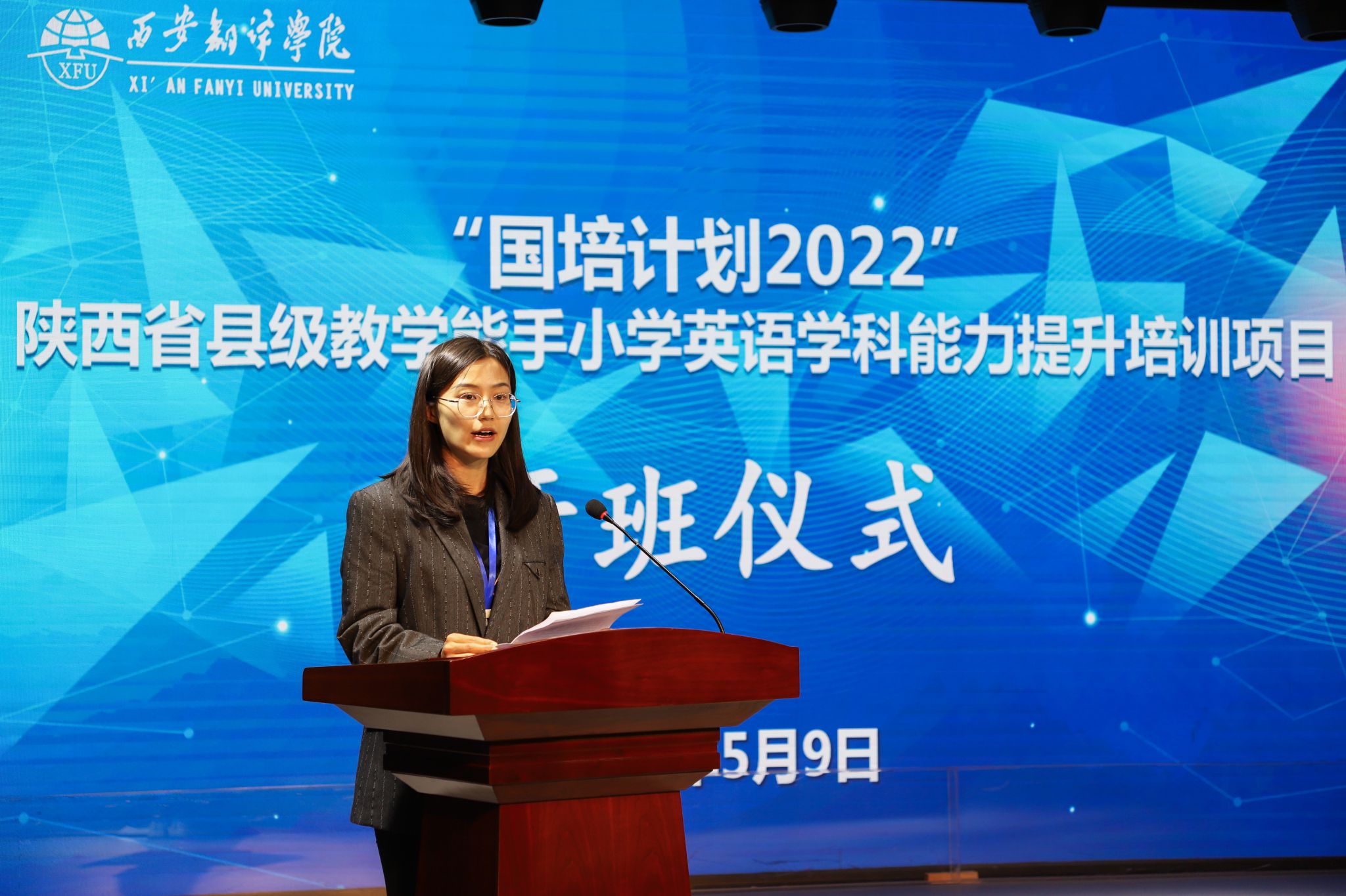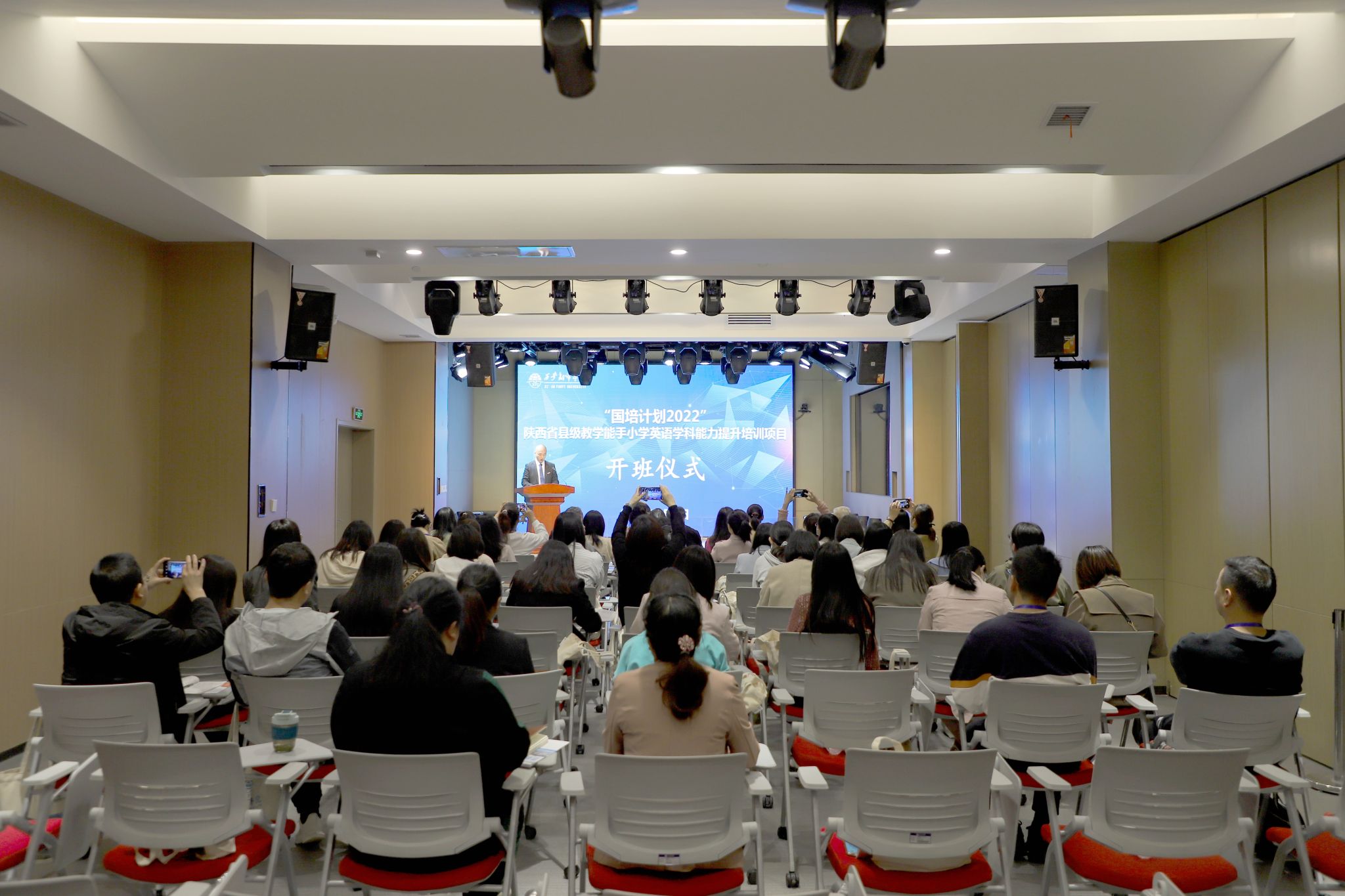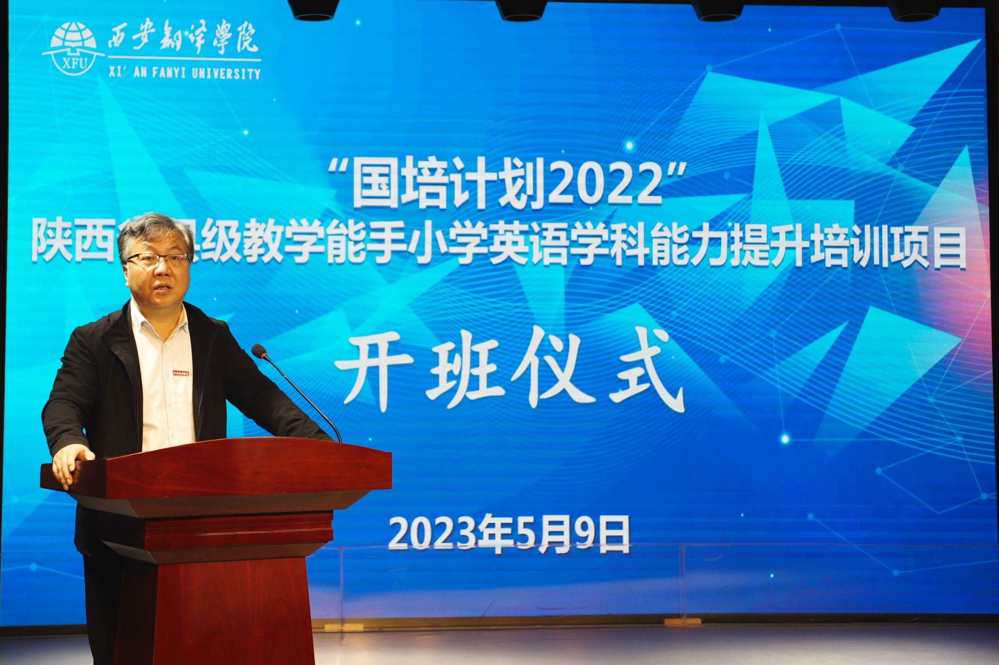 为落实立德树人的根本任务,适应学科核心素养新要求,提升学科创新能力,打造学科教学骨干团队,5月9日上午,由陕西省教育厅主办,西安翻译学院承办的“国培计划2022”小学英语学科县级教学能手能力提升培训项目在西译正式开班。校党委副书记、副校长郭炜,教务处处长秦晓梅,人力资源处副处长、教师发展中心副主任武娟,英文学院副院长李鲜花,我校外籍专家、陕西省人民政府三秦友谊奖获得者Dirk出席开班仪式。共有来自全省各地市的60余名小学英语学科教师参加本次培训项目。继续教育学院副院长刘远征主持开班仪式。