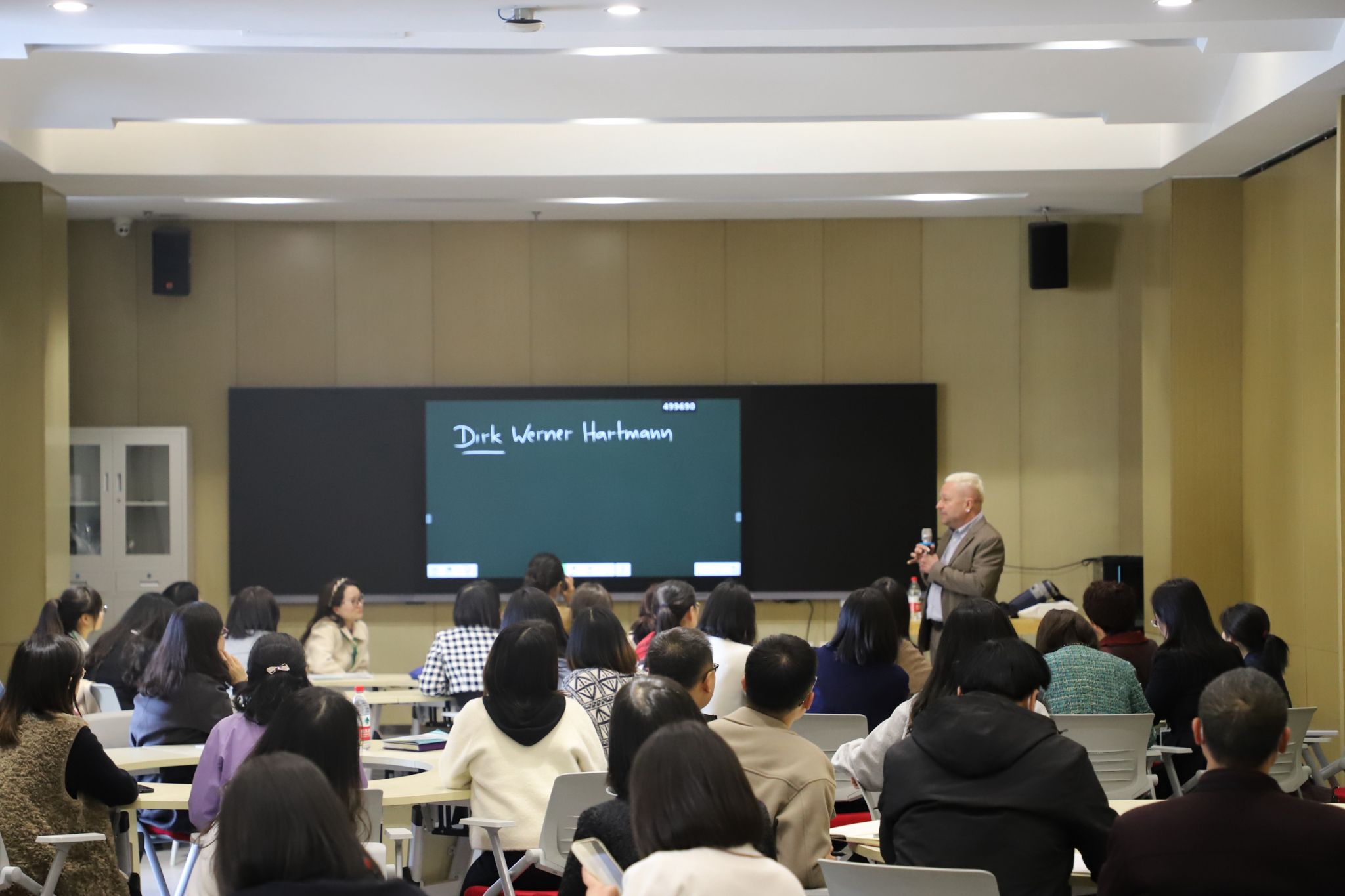开班仪式结束后,西安翻译学院外籍教师张克与学员们进行口语交流,共同探讨高中英语教学方法,大家热情高涨,探讨氛围浓厚,拉开了本次培训课程的序幕。