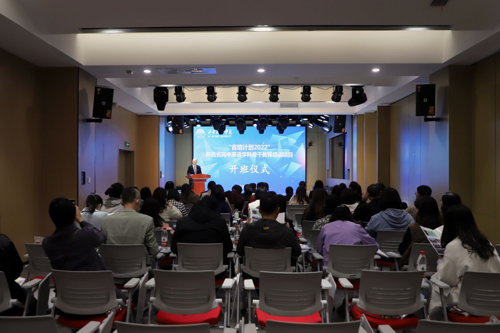 为进一步落实我省高中英语教师队伍“以德为先、骨干引领”的教学目标,立足陕西高中英语骨干教师的项目定位,以先进的课程理念、丰富的教学经验,推动陕西省高中英语新课程教学高水平实施,3月28日上午,由陕西省教育厅主办,西安翻译学院承办的“2022年陕西省高中英语学科骨干教师研习班”在西区体验中心报告厅举行。西安翻译学院党委副书记、副校长郭炜,教务处副处长孟贤军,人力资源处副处长、教师发展中心副主任武娟,英文学院副院长李鲜花等领导出席。共有近50名来自全省各地市高中英语骨干教师参加。西安翻译学院继续教育学院副院长刘远征主持开班仪式。